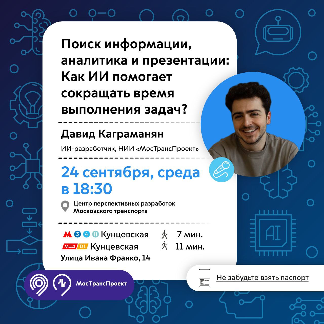 В среду, 24 сентября, об этом расскажет Давид Каграманян, один из ИИ-разработчиков НИИ «Мостранспроект». Спикер объяснит, как: