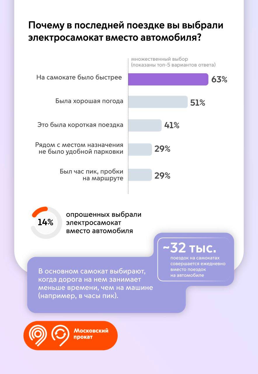 🔹 16% пользователей выбрали самокат вместо поездки на такси, а 14% — вместо поездки на личном автомобиле.