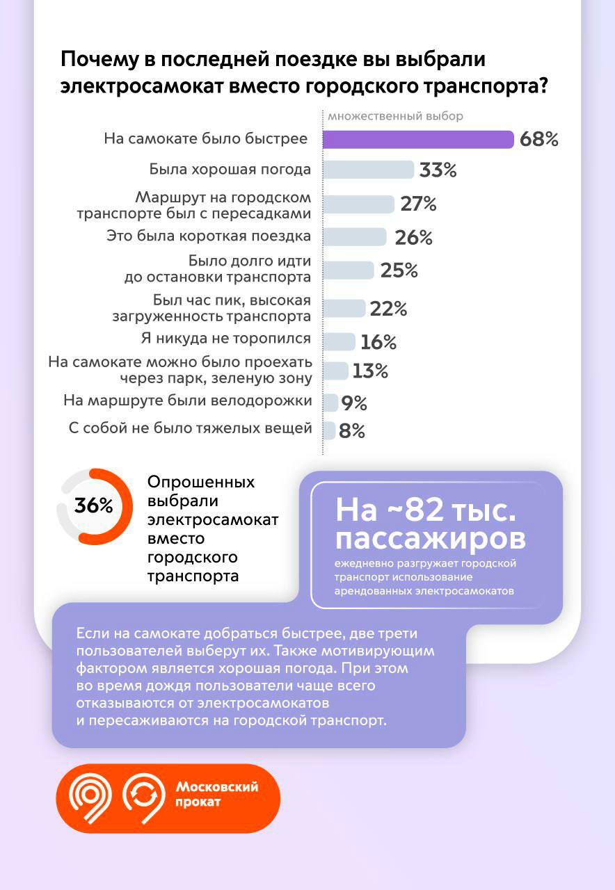 🔹 36% опрошенных выбрали электросамокат вместо поездки на городском транспорте.