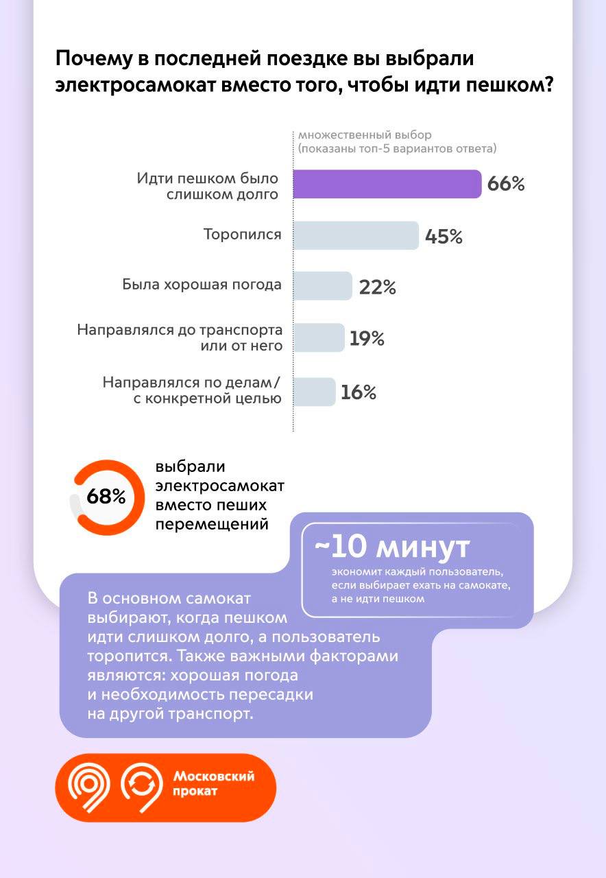 🔹 66% респондентов выбрали в последней поездке электросамокат, потому что идти пешком было слишком долго. Выбирая самокат, в среднем каждый пользователь экономит около 10 мин.