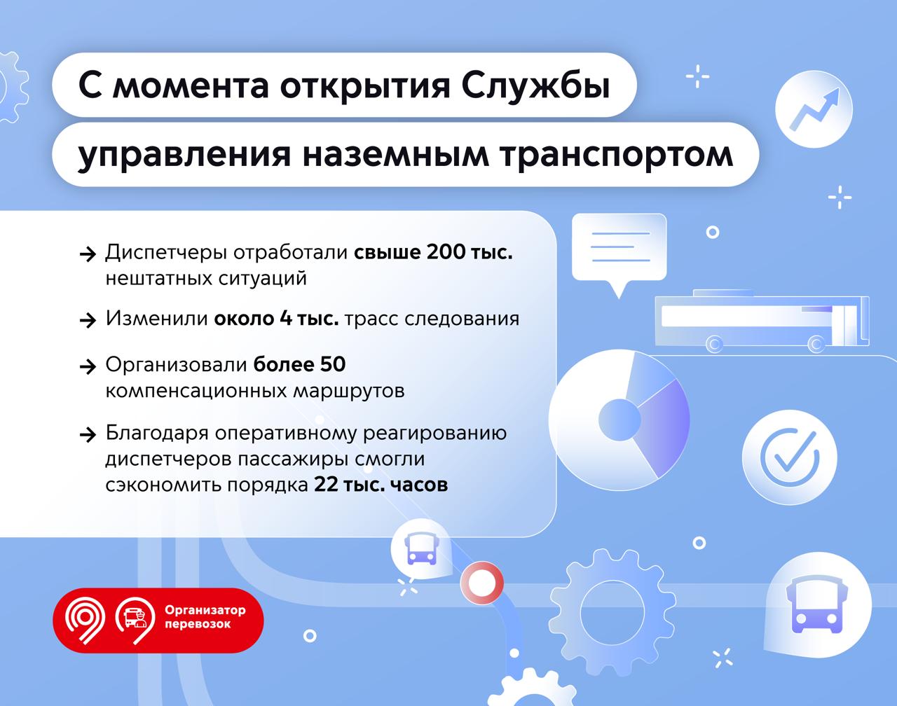 В 2022 году в Москве создали один из крупнейших диспетчерских центров в составе Службы управления наземным транспортом. Его сотрудники 24/7 обеспечивают бесперебойную работу наземных маршрутов в режиме онлайн. Это помогает оперативно решать нештатные ситуации на дороге, а пассажирам экономить время в пути.