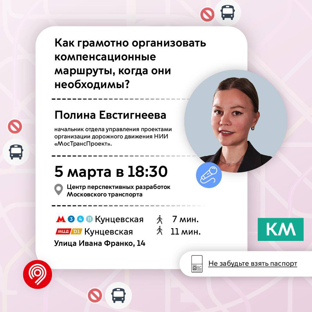 Расскажет Полина Евстигнеева, начальник отдела управления проектами организации дорожного движения НИИ «МосТрансПроект». На новой лекции в Центре перспективных разработок Московского транспорта обсудим: