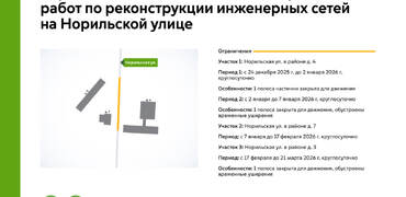 С 24 декабря 2025 г. до 21 марта 2026 г. на участках Норильской улицы будет недоступна для движения 1 полоса