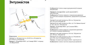 В период с 29 декабря 2025 г. до 24 августа 2027 г. на участках шоссе Энтузиастов и местных проездов будут недоступны для движения 1-3 полосы