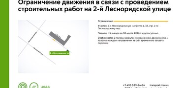 С 5 января до 30 марта 2026 г. на участке 2-й Леснорядской улицы будут недоступны для движения 2 полосы