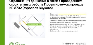 В период с 12 ноября 2025 г. до 15 февраля 2027 г. на участках Проектируемого проезда № 6702 (аэропорт Внуково) будут недоступны для движения 1-3 полосы